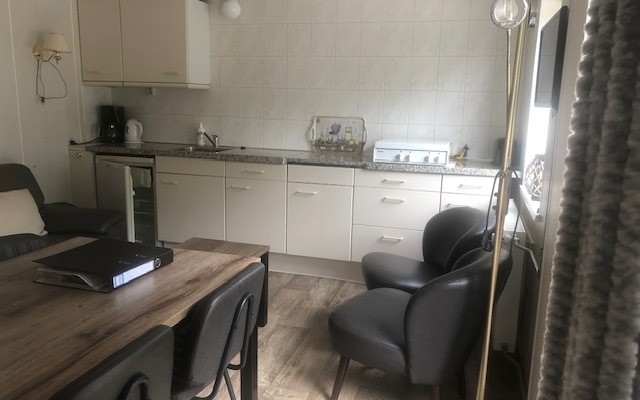 - Küchenzeile mit Gasherd, Kühlschrank und Kaffeemaschine