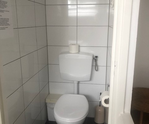 - Badezimmer mit Dusche, Toilette und Waschbecken