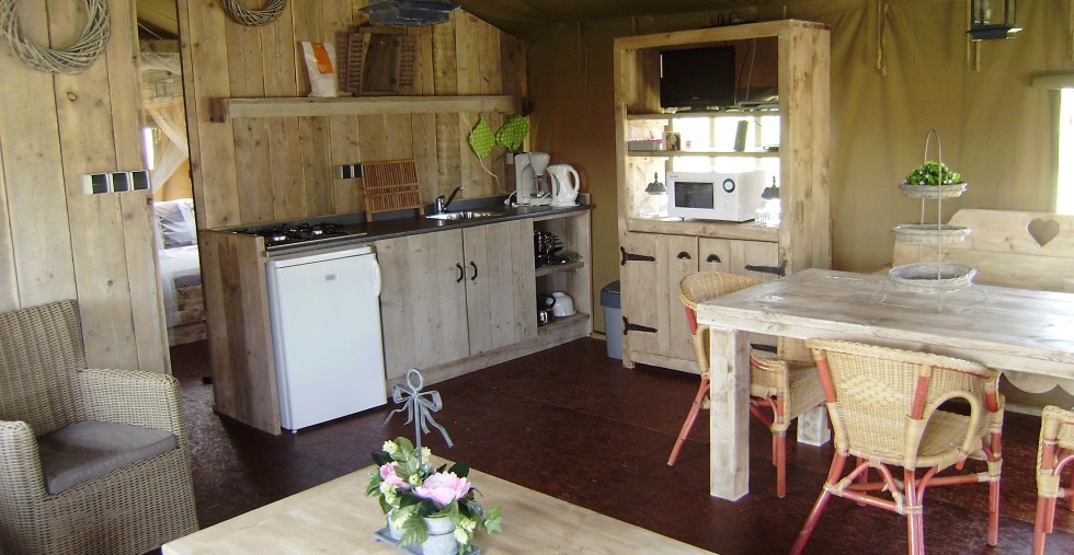 Das Zelt steht auf einem Lattenrost, damit Sie nicht auf dem Boden zu leben brauchen. Ihre luxuriöse Unterkunft verfügt über einen komplett eingerichteten Küchenblock mit Spülbecken, 4-Platten-Gasherd, Kühlschrank, Mikrowellenherd, Kaffeemaschine und Wasserkocher. Töpfe, Pfannen, Service und Besteck - an alles wurde gedacht. Sie können dort gleich Ihre Kochkünste zur Geltung bringen!