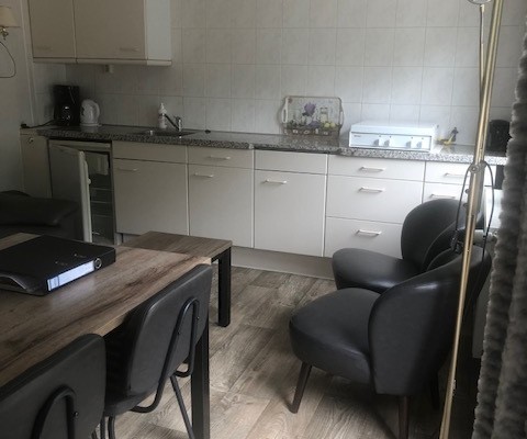 - Keukenblok met een gasfornuis, koelkast en koffiezetapparaat